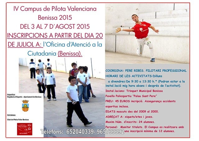 La regidoria d’Esports en col·laboració amb el Club de Pilota Futur, organitza el Campus de Pilota 2015, que es desenvoluparà a Benissa del 3 al 7 d’agost a les instal·lacions del Trinquet Municipal i al Palau Sant Pere.