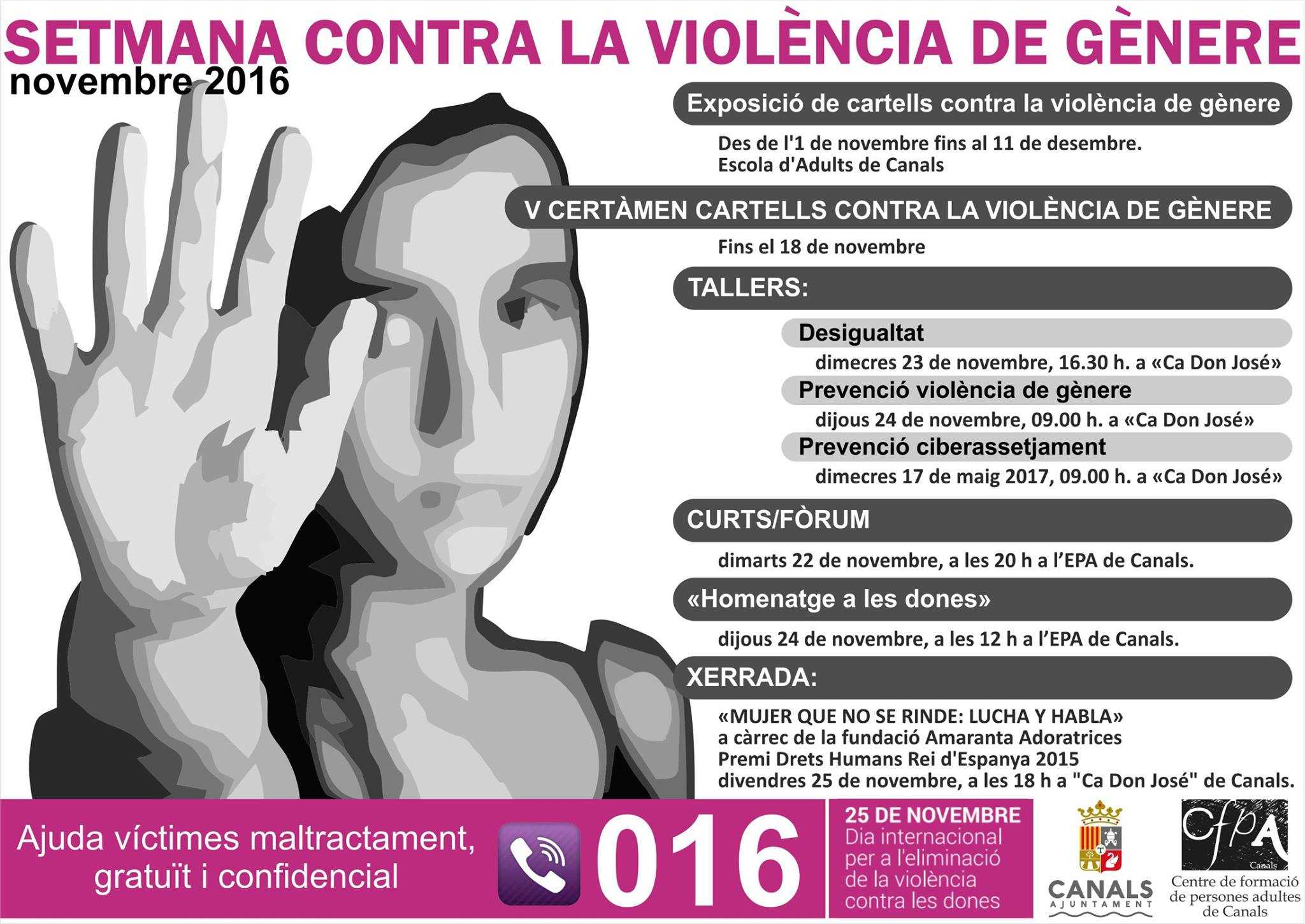 En el que portem d’any 2016, 37 dones han sigut assassinades al nostre país per violència de gènere i hi ha altres 8 casos en investigació. 25 menors s’han quedat orfes; motius pel quals l’Ajuntament de Canals i l’EPA han sumat esforços encetant aquesta setmana de conscienciació i sensibilització amb l’objectiu de frenar aquesta lacra social.