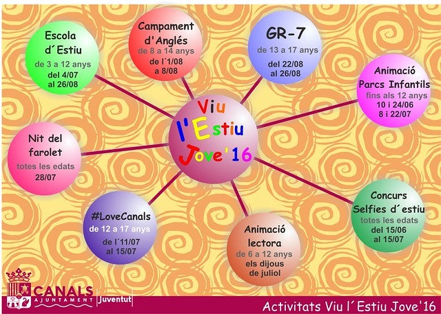 Sota leslògan , “VIU LESTIU JOVE A CANALS 2016”, la regidoria de joventut de lAjuntament de Canals ha programat per a estos mesos un gran nombre d’activitats per a xiquets i joves fins els 18 anys.