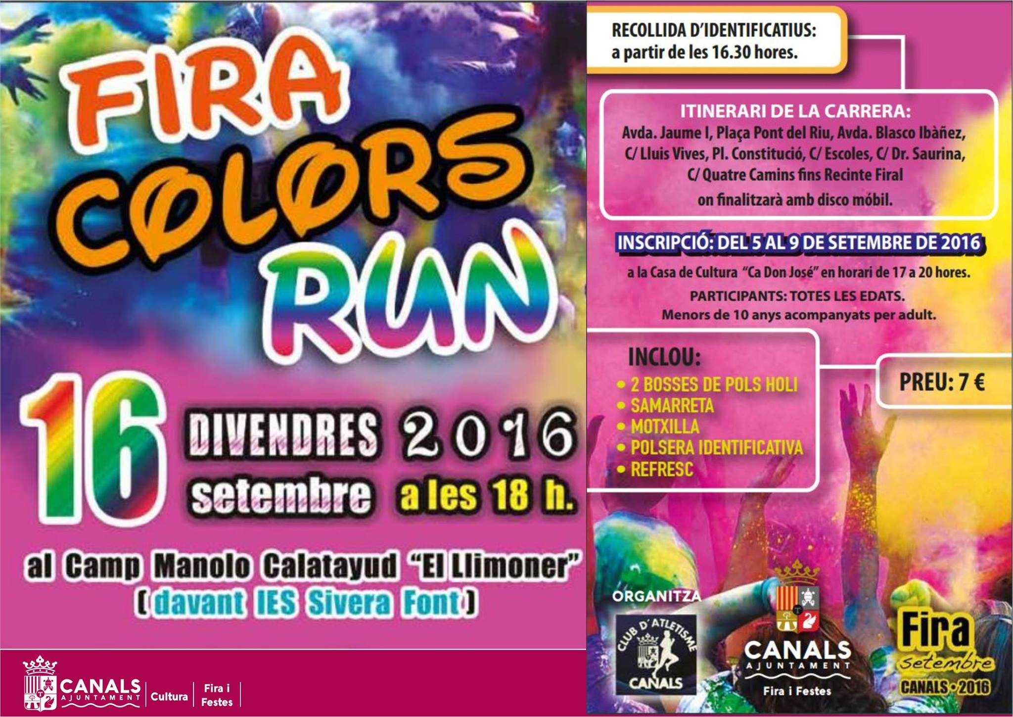 La regidoria de fira i festes de lAjuntament de Canals ha tret al llum les bases que regiran alguns dels actes que es duran a cap en la propera fira de Setembre. Una de les novetats desta fira és la prova anomenada colors run, aquésta segons comentava la regidora Celia Ibàñez “es una activitat que a hores dara està molt de moda i que a la fira de Canals enguany volem incloure-la perquè pensem que agradarà molt, sobretot entre el públic més jove”. Es tracta, continuava dient la regidora “ duna cursa on els participants en diferents punts habilitats rebran per part de col.laboradors una plutja de colors, este acte conta amb la col.laboració del club datletisme Canals que és qui veritablement assoleix lorganització del mateix”.