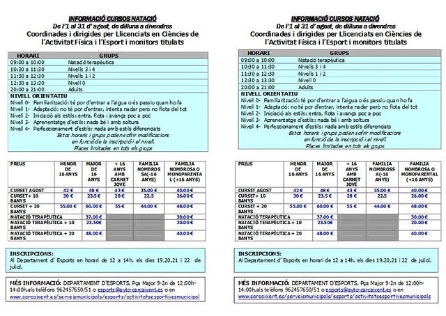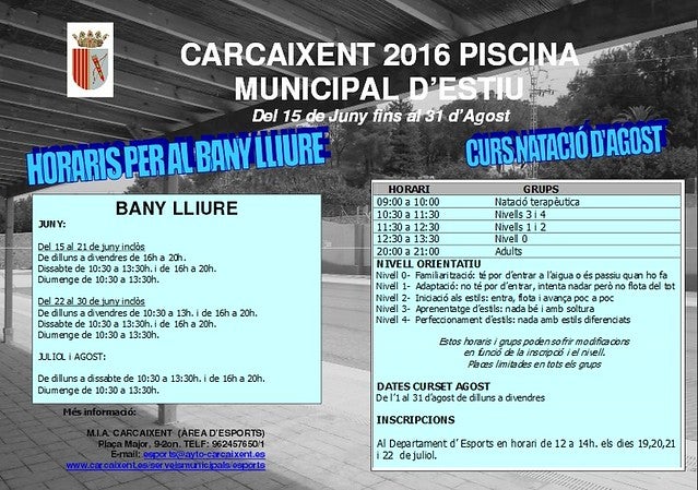 Amb l’estiu arriba la possibilitat de gaudir de la piscina descoberta del poliesportiu municipal i de les activitats i cursos que s’hi oferiran. Podràs gaudir del bany lliure en els horaris que a continuació exposem o inscriure’t als cursets del mes d’agost que oferim, que van per nivells del 0 al 4 (el Nivell 0: Familiarització; i el Nivell 4: Perfeccionament d’estils).
