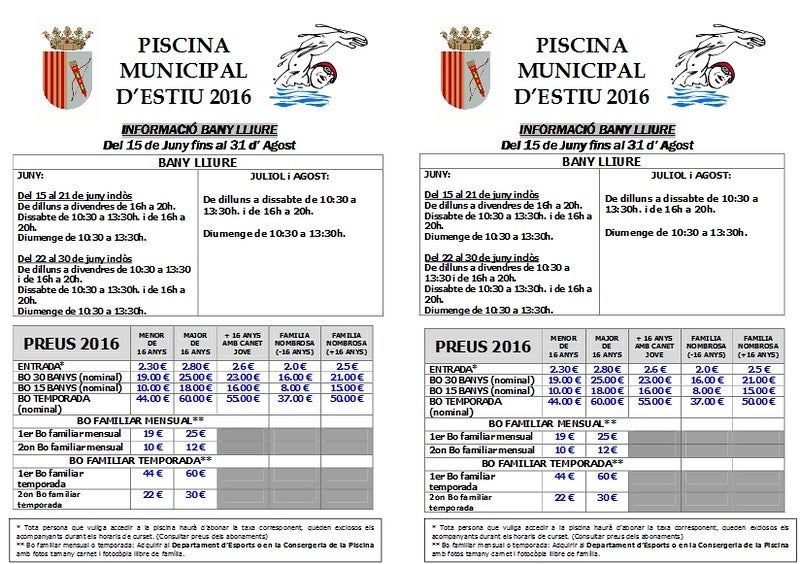 Amb l’estiu arriba la possibilitat de gaudir de la piscina descoberta del poliesportiu municipal i de les activitats i cursos que s’hi oferiran. Podràs gaudir del bany lliure en els horaris que a continuació exposem o inscriure’t als cursets del mes d’agost que oferim, que van per nivells del 0 al 4 (el Nivell 0: Familiarització; i el Nivell 4: Perfeccionament d’estils).