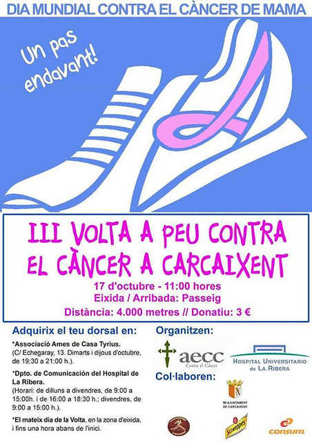 La III Volta a peu tindrà lloc el proper 17 d’octubre amb un recorregut de 4 quilòmetres per làrea urbana de Carcaixent. Els dorsals ja es poden adquirir a canvi d’un donatiu de 3€ a l’Associació d’Ames de Casa Tyrius, al departament de comunicació de l’Hospital de la Ribera i en la major part de farmàcies locals i altres comerços col·laboradors. També es podran fer inscripcions el mateix dia de la volta un hora abans al Passeig ,lloc d’inici i final de l’activitat.