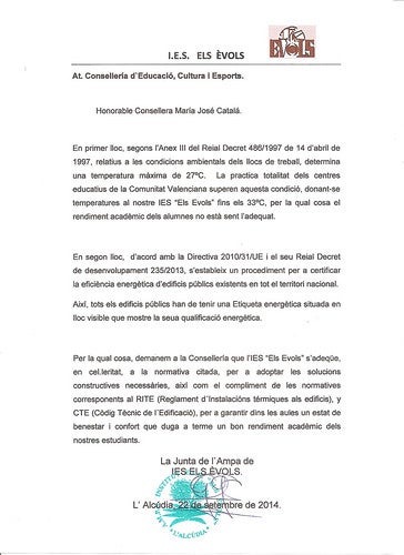 Donats els problemes que s’han experimentat a col·legis i instituts en este principi de curs 2014-15, la Junta de l’Ampa de l’IES Els Évols de l’Alcúdia ha decidit enviar una carta a la Consellera d’Educació, la qual adjuntem, demanant que es prenguen solucions i s’acomplisquen les normatives en vigor quant a condicions ambientals de treball, Reglament d’Instal·lacions tèrmiques i Còdig Tècnic d’Edificació.