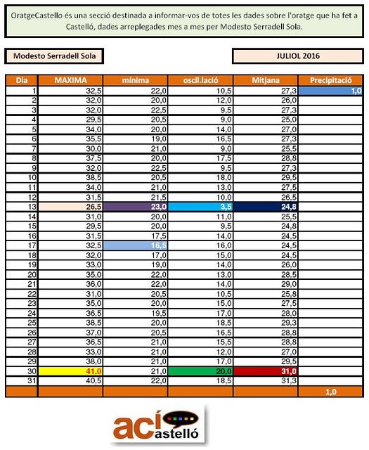 La nit més fresqueta va ser el dia 17 amb 16,5°C, mentre que la temperatura màxima registrada es va donar el dia 30 amb 40°C. De fet, els 2 últims dies del mes van ser els més calorosos (per sobre dels 40°C), tal volta preparant-nos per a l’entrada d’agost.