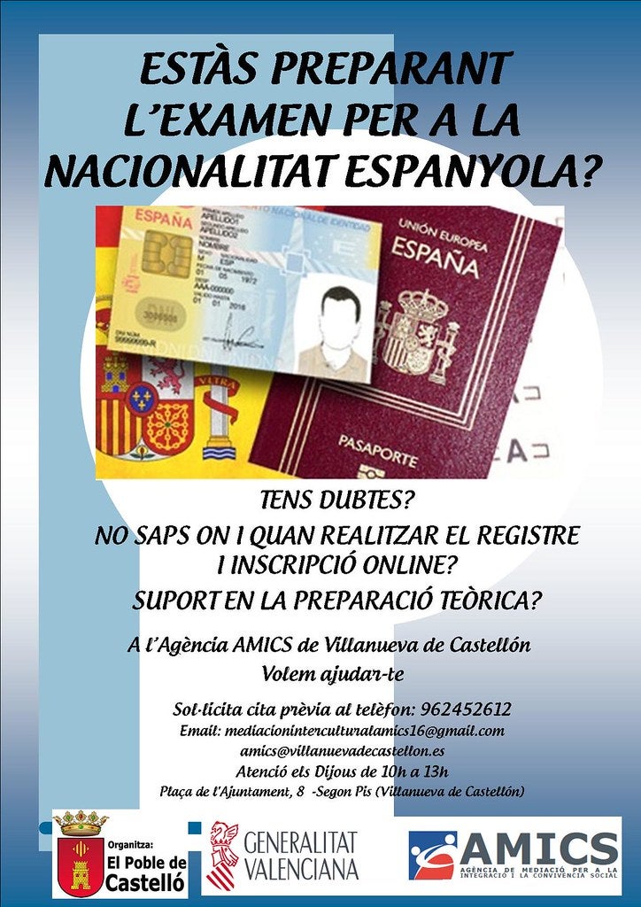 L’Agència Amics de l’Ajuntament de Vva. de Castellón posa en marxa un nou servei per a totes les persones que volen fer l’examen per obtindre la nacionalitat espanyola.