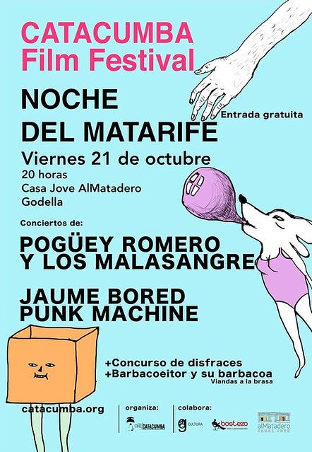 Els concerts de Pogüey Romero i Los malasangre i Jaume Bored Punk Machine formen part del programa de La Nit del Matarife, completada amb un concurs de disfresses i un sopar de barbacoa. L’entrada és gratuïta. Els organitzadors presentaran la programació del festival, que enguany inclou la projecció de seixanta-set films, entre curtmetratges i llargmetratges, nou d’ells realitzats per directors valencians. Entre els llargmetratges de la secció oficial, es projectaran les guardonades Cos de la directora polonesa Malgorzata Szumowska, Ós de Plata en el Festival de Berlín, i La invitació de Karyn Kusama, millor pel·lícula en l’última edició del Festival de Sitges. Tota la programació es pot consultar en www.catacumba.org.