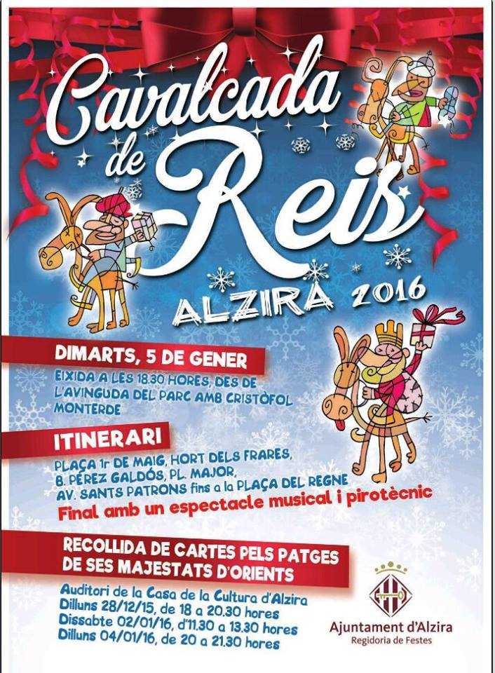 Si no hi ha cap inconvenient, la cavalcada començarà a les 18.30 hores en l’avinguda del Parc encreuament amb el carrer Cristòfol Monterde; passarà per la plaça 1 de Maig, Hort dels Frares, Benito Pérez Galdós, Plaça Major i avinguda Sants Patrons, i finalitzarà en la plaça del Regne.