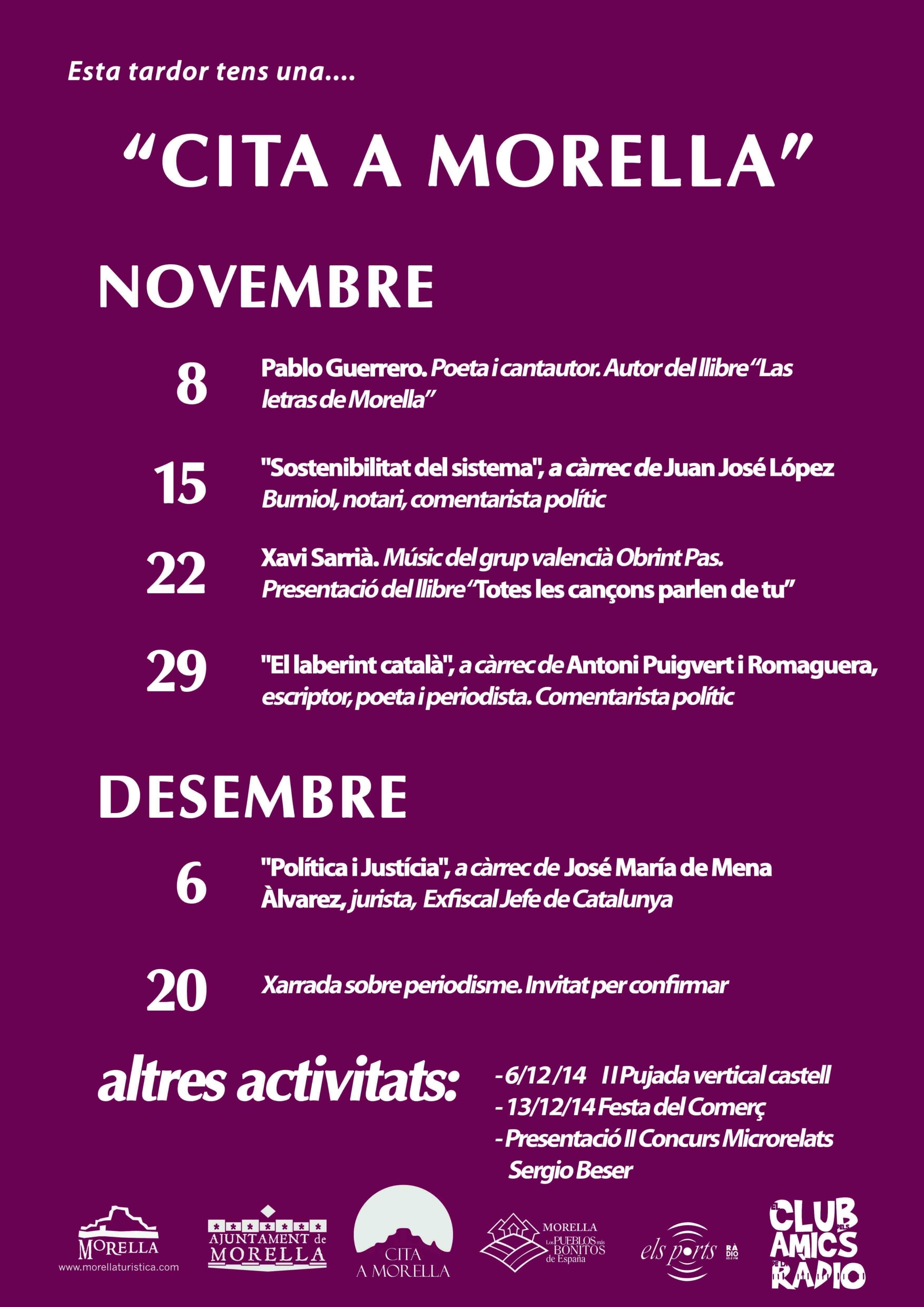 Cal recordar que el “Cita a Morella” és un espai que pretén convertir a Morella en un lloc de reflexió cultural sobre diferents temes d’interès i d’actualitat. Entre 2013 i 2014 s’ha potenciat aquest cicle, portant a Morella a periodistes o escriptors del prestigi de Javier Sierra, Rosa Maria Calaf, Rosa Regàs, Víctor Amela, Elena Moya, amb les seves novel•les El Càtar Imperfecte i La Mestra Republicana, ambientades a Morella, Martí Gómez, Manuel S. Jardí o Manuel Milián Mestre. De nou, aquest cicle de conferències i activitats estarà organitzat per l’Ajuntament de Morella, Els Ports Ràdio i el Club d’Amics de la Ràdio.
