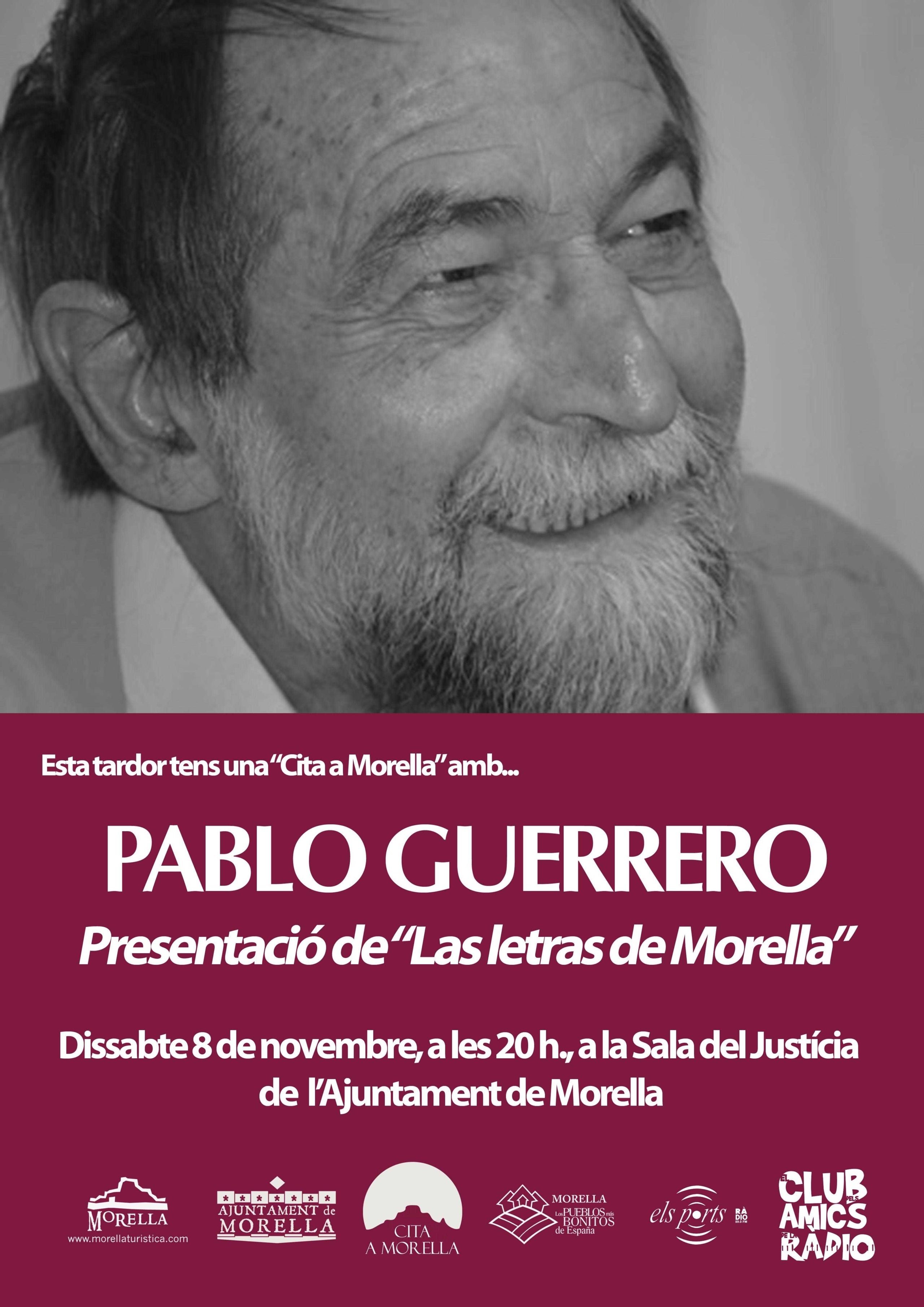 Cal recordar que el “Cita a Morella” és un espai que pretén convertir a Morella en un lloc de reflexió cultural sobre diferents temes d’interès i d’actualitat. A més de Pablo Guerrero, en les pròximes setmanes participaran en aquest espai els politòlegs Juan José López Burniol (15/11) i Antoni Puigverd (29/11), el músic i escriptor Xavi Sarrià (22/11), periodistes o juristes, com José María de Mena Álvarez (6/12). Entre 2013 i 2014 s’ha potenciat aquest cicle, portant a Morella a periodistes o escriptors del prestigi de Javier Sierra, Rosa Maria Calaf, Rosa Regàs, Víctor Amela, Elena Moya, amb les seves novel•les El Càtar Imperfecte i La Mestra Republicana, ambientades a Morella, Martí Gómez, Manuel S. Jardí o Manuel Milián Mestre. De nou, aquest cicle de conferències i activitats estarà organitzat per l’Ajuntament de Morella, Els Ports Ràdio i el Club d’Amics de la Ràdio.