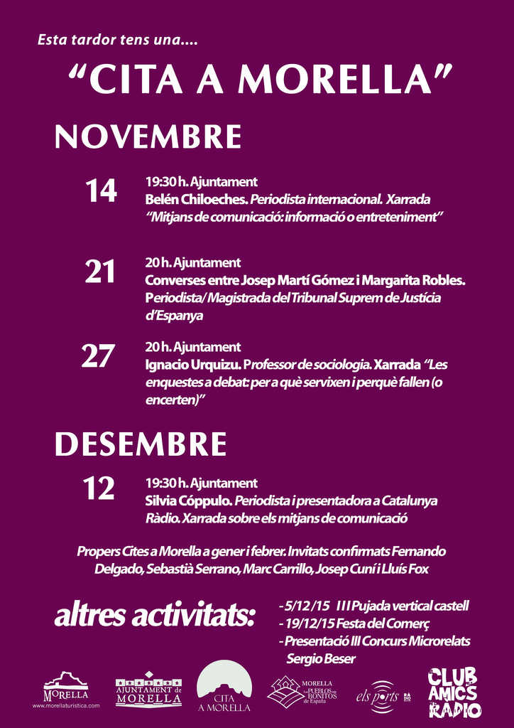 A més, en les pròximes setmanes estaran a la localitat els periodistes Martí Gómez i Silvia Cóppulo, la magistrada del Tribunal Suprem d’Espanya, Margarita Robles, i el sociòleg Ignacio Urquizu. A més, l’agenda d’aquest cap de setmana porta més activitats, com l’excursió senderista per Pereroles, la visita a l’Observatori Astronòmic o el dia de la gent gran, amb el concert de la Rondalla de Morella de diumenge a la vesprada.