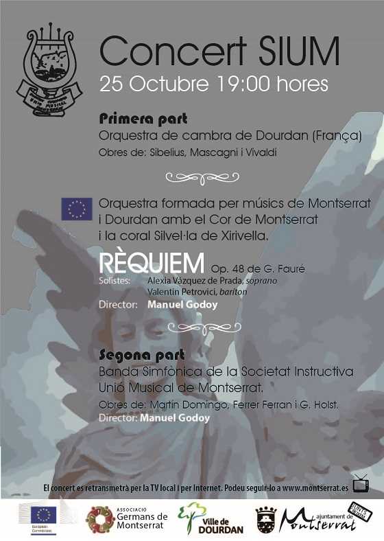 L’Ajuntament de Montserrat ha fet una crida a la participació de tots ells, tant de les conferències que seran a càrrec de Manuel Godoy (director de la banda de Montserrat) i Inmaculada Rodríguez Piñeiro (eurodiputada del PSOE), com del “magnífic concert” que esta preparant-se entre els alumnes i professors del conservatori de Dourdan, el cor de la nostra Societat, la coral Silvel·la de Xirivella i la nostra banda de música, dirigit per Manuel Godoy.