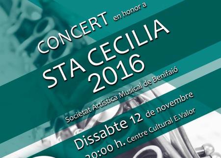 CONCERT en honor a SANTA CECILIA A càrrec de la SOCIETAT ARTÍSTICA MUSICAL DE BENIFAIÓ. Dissabte 12 de novembre A les 20:00h Al Centre Cultural Enric Valor.