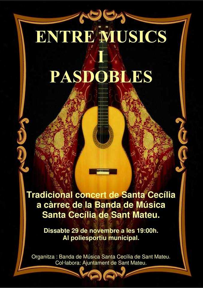 Dissabte 29 de novembre a les 19 h al poliesportiu municipal, la Banda de Música Santa Cecília de Sant Mateu ha preparat el concert titulat “Entre músics i Pasdobles”