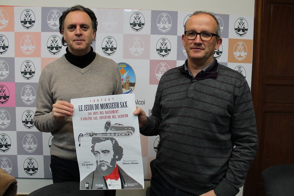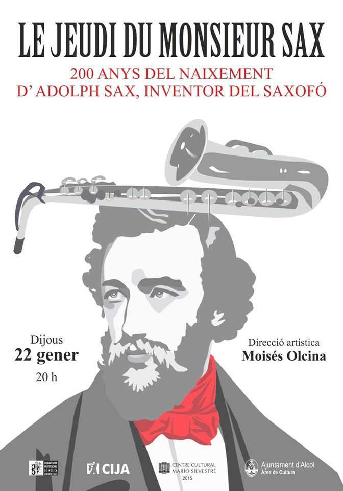 El músic Moisés Olcina, de la mà de la Regidoria de Cultura, i amb la col•laboració del Conservatori Municipal Joan Cantó, del Club Itinerant de Jazz d’Alcoi (CIJA) i de diversos músics de les nostres comarques, han organitzat per dijous a les 20 hores al Centre Cultural un concert molt especial en commemoració del 200 aniversari del naixement d’Adolphe Sax, inventor del saxofon.