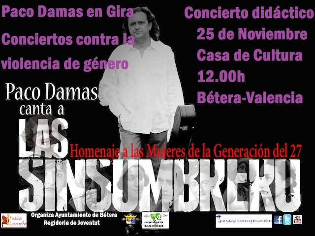 El cantant i compositor Paco Damas farà un homenatge a les dones de la Generació del 27 i cantarà a ‘LAS SINSOMBRERO’ dins d’un cicle de concerts contra la violència masclista de finalitat didàctica.