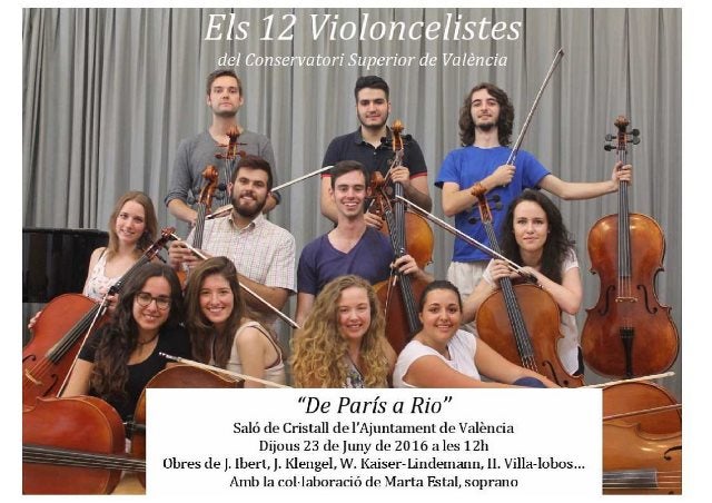 Amb la direcció de Pere Joan Carrascosa, els 12 joves violoncel·listes presenten un viatge musical anomenat “De París a Rio”. L’actuació comptarà amb la col·laboració de Marta Estal (soprano), que interpretarà la “Cantilena” de la Bachiana núm. 5 d’Heitor Villa-Lobos. També es podran escoltar peces de J. Ibert, J. Klengel, J. S. Bach i Wilhelm Kaiser Lindemann, entre altres.
