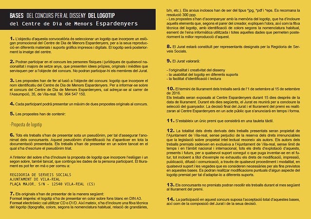 EEl Centre de Dia de Menors Espardenyers de Vila-real cerca un logotip que el represente i per això ha convocat un concurs, al que es pot presentar qualsevol persona major de 16 anys, que podrà lliurar un màxim de dos dissenys que hauran de ser propis, originals i inèdits. El guanyador s’emportarà un premi únic, consistent en una tableta tàctil, i el seu logotip serà posteriorment la imatge del centre i s’utilitzarà en diferents materials i suports gràfics impresos i digitals.