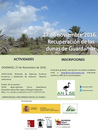 L’Associació ANSE (Associació de Naturalistes del Sud-est) amb la col·laboració de l’Ajuntament de Guardamar del Segura realitzarà accions de conservació de la flora dunar. L’àmbit d’actuació serà al marge esquerre de la desembocadura del riu Segura, ja que existeixen àmplies extensions d’espècies exòtiques invasores i, per tant, és recomanable la seva retirada.