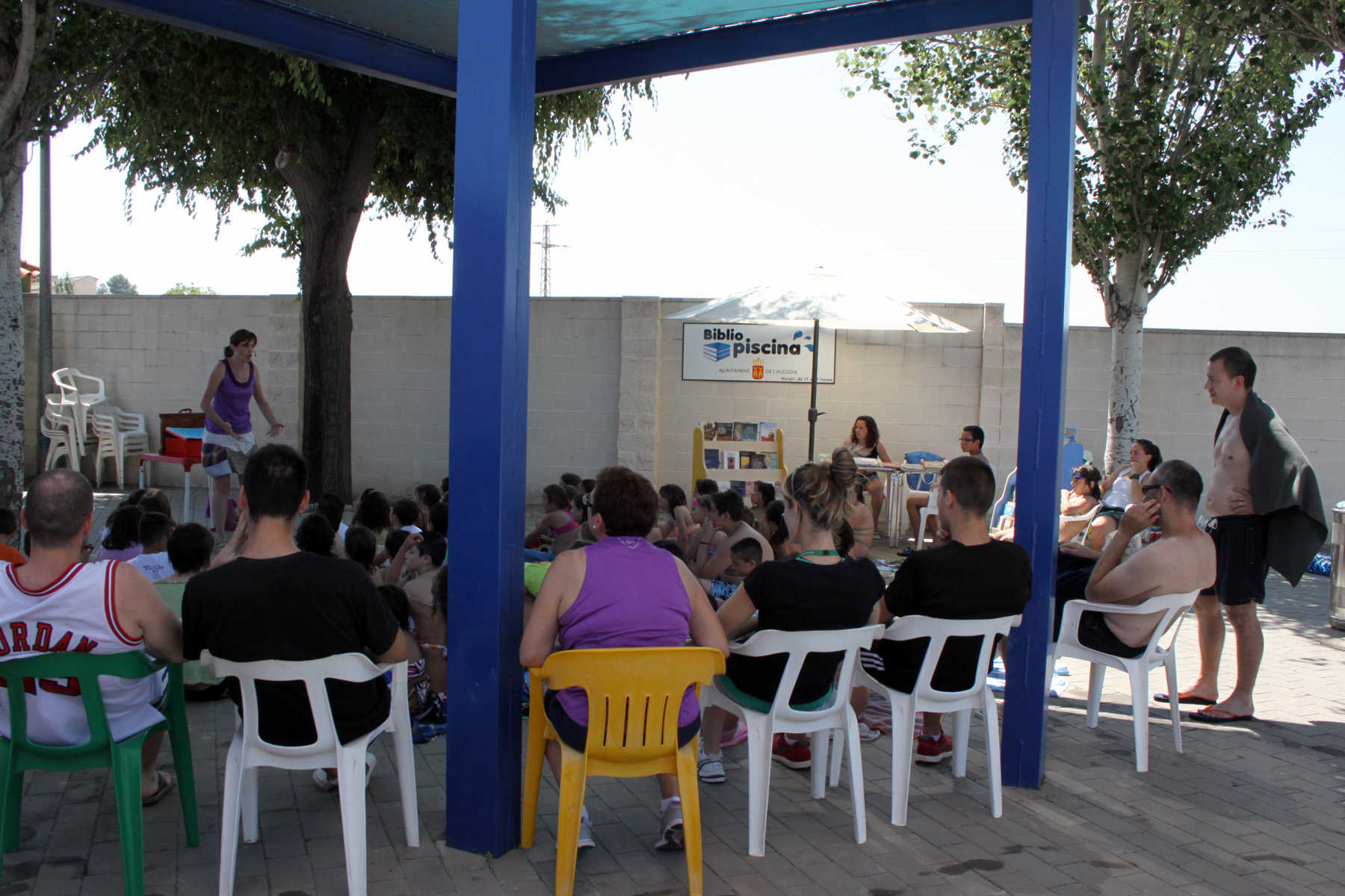 Fantasmes que no ho són, animalets molt llestos, llops ingenus i tot un seguici de personatges divertits s’han donat cita a la fresca, davant els ulls oberts d’una setantena de xiquets i d’alguns adults que no s’han volgut perdre els contes d’Almudena. Després, alguns d’ells s’han passat pels expositors de la bibliopiscina, i han triat algun exemplar per a seguir alimentant la imaginació.