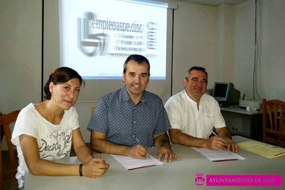 L’alcalde, Antonio Puerto, en nom i representació de l’Ajuntament d’Asp, i Tomás López Pérez, com a apoderat del Centre Especial d’Ocupació EMPLEOASPE.DISC, S.L., van signar el conveni de col·laboració pel qual l’Ajuntament d’Asp aporta 5.400 euros per a l’exercici 2015. A la signatura del conveni ha assistit així mateix Isabel Pastor Soler, regidora de Serveis Socials.