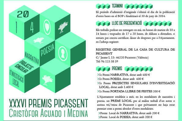 La Regidoria de Cultura de l’Ajuntament de Picassent ha convocades les Bases de la 36a edició dels Premis Picassent-Cristòfor Aguado i Medina. Amb un total de 3.200 euros, les modalitats seran les següents: Narrativa, Poesia, Investigació Local i Portada del Llibre de Festes 2014. Els premis estaran dotats de la següent manera: