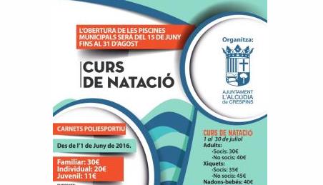 Curs de Natació 2016, Apertura de les piscines municipals serà del 15 de juny fins al 31 dagost Els cursos desde l1 de Juny de 2016