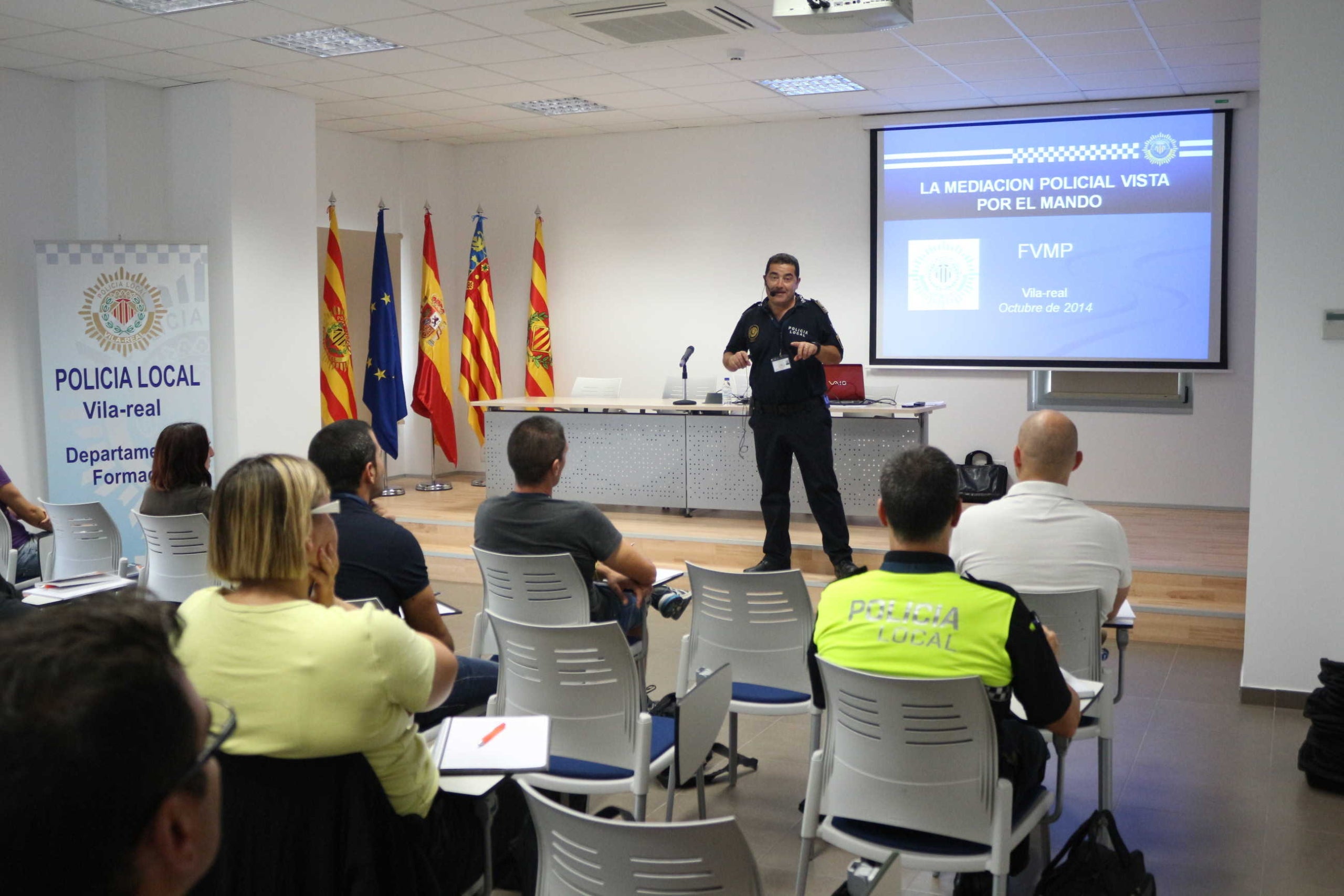 Vila-real, 6 d’octubre de 2014. L’Escola de Formació de la Policia Local (Efopol) de Vila-real obri hui les classes del primer Curs d’Especialista en Mediació Policial, un curs pioner que ja es va testar aquest estiu amb la formació en mediació d’una delegació de Brasil i que torna a convertir Vila-real i la seua Policia Local en un referent en la mediació com a via dialogada per a la resolució de conflictes des de l’àmbit policial. El curs, que imparteix la Federació Valenciana de Municipis i Províncies (FVMP), compta amb 110 hores lectives i formarà en mediació un total de 25 agents procedents de tota la Comunitat Valenciana i fins i tot un policia de Brasil. “Es tracta de l’únic curs d’aquestes característiques que s’ofereix en tota el territori autonòmic i la FVMP ha triat Vila-real per a impartir-lo, com no podia ser d’altra manera, per la solvència i l’aposta pionera de la nostra Policia Local per la mediació”, valora l’alcalde, José Benlloch.