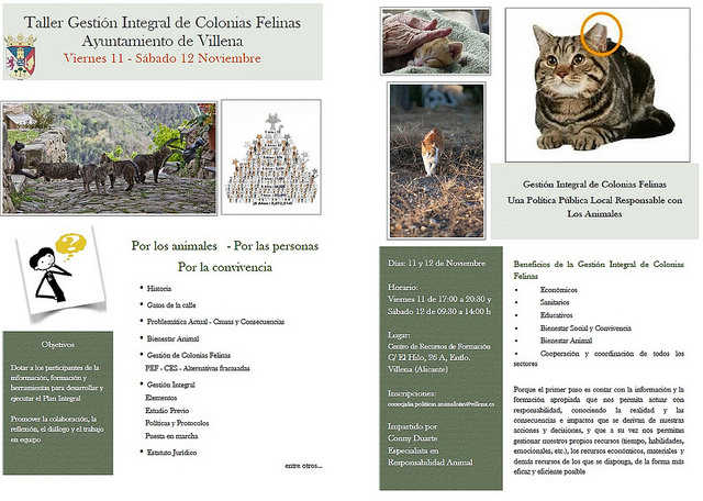 La regidoria de Polítiques Animalistas de l’Ajuntament de Villena, en col·laboració amb l’Associació Protectora d’Animals i Plantes han organitzat un taller gratuït de formació en el coneixement i control de les colònies de felins a la ciutat. Aquest curs de formació és gratuït i es desenvoluparà el divendres 11 de novembre de 17:00 a 20:30 i el dissabte de 9:30 a 14:00 hores en les instal·lacions municipals del Carrer El Fil.