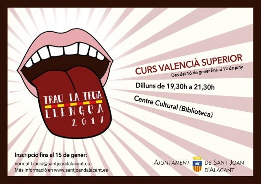 El curs del s’impartirà des del 16 de gener fins al 12 juny, tots els dilluns de 19,30h a 21,30h. Per a inscriure’s, cal omplir el formulari que s’adjunta i enviar-lo a normalitzacio@santjoandalacant.es abans del 15 de gener. També pots informar-te a l’Ajuntament, Casa de Cultura i Centre Cultural (Biblioteca).