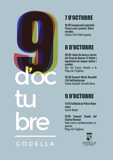 El Grup de Danses El Poblet s’encarregarà enguany d’encetar els festejos amb motiu del dia 9 d’Octubre —jornada festiva en què es recorda l’entrada de Jaume I a la ciutat de València—. Serà la vespra. Dissabte, dia 8, a les 20 hores, oferiran un Aplec de Dansa que anirà des del carrer Abadia a la plaça de l’Església. Més tard, a les 22.30 arribaran des de Mallorca, al teatre Capitolio, Maria Roselló i els Botifanfarrons.