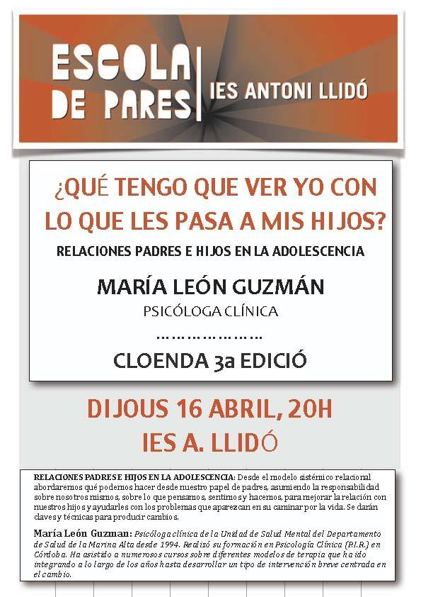 L’Escola de Pares de l’IES Antoni Llidó de Xàbia clausura la setmana vinent el seu cicle de conferències amb una xarrada de la psicòloga clínica María León, qui abordarà les relacions entre pares i fills en l’adolescència.