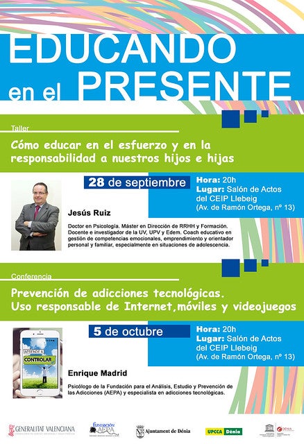 2. Conferència: PREVENCIÓ D’ADDICCIONS TECNOLÒGIQUES. ÚS RESPONSABLE D’INTERNET, MÒBILS I VIDEOJOCS. 5 d’octubre, 20h CEIP Llebeig (Dénia). El ponent serà Enrique Madrid, Psicòleg de la Fundació AEPA i especialista en addiccions tecnològiques. El que pretén aquesta conferència és transmetre i nodrir als pares i mares de ferramentes, per tal que els seus fills o filles utilitzen de manera adequada les noves tecnologies (internet, mòbil, xarxes socials i videojocs), mostrant els riscos i oferint pautes per diferenciar entre l’ús, l’abús i l’addicció a les TIC. Així també, pautes per fomentar els factors de protecció.