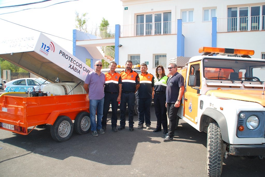 Per un altre costat, i amb la mateixa finalitat, s’ha fet entrega d’un remolc amb una bomba i un dipòsit de 600 litres d’aigua. Amb ésta, segons va explicar el cap de Protecció Civil de Xàbia, José Vicente Sierra, els agents poden treballar a una distància màxima de 500 metres i cobrir un desnivell de fins a 100 metres d’alt. El cabdal que llança varia entre els 30 i els 180 litres d’aigua per minut.