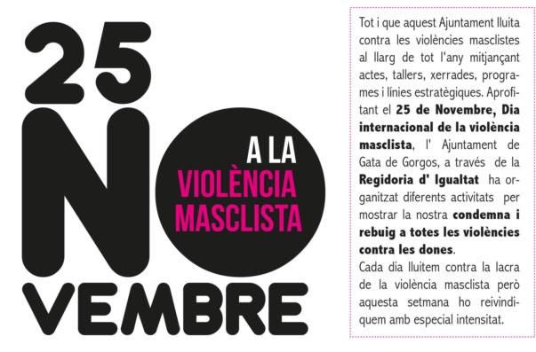 Durant tota la setmana, els alumnes de l’IES Matemàtic Vicent Caselles Costa participen en un taller de conscienciació a càrrec d’Àngels Soler, formadora i regidora de Desenvolupament Local. Pel que fa a l’alumnat d’Infantil i Primària del C.P. Santíssim Crist, la psicòloga Rebeca Diego realitzarà uns tallers educatius de prevenció de violència de gènere, Dones amb ales.