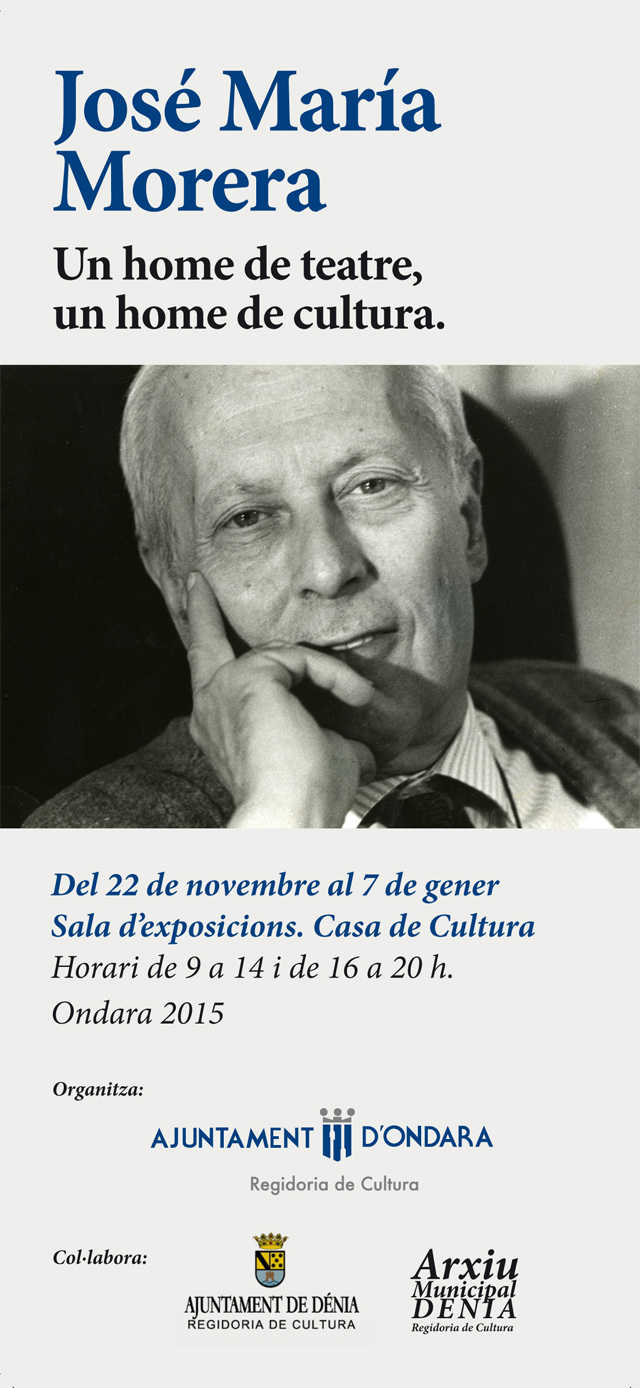 A continuació, a les 12:30 hores, es procedirà a inaugurar en la Casa de Cultura d’Ondara l’exposició “José Maria Morera, un home de teatre, un home de cultura”, que es podrà presenciar en la Sala d’Exposicions fins al 7 de gener.