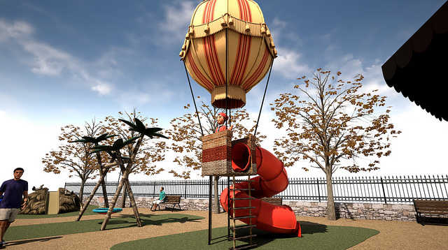 L’element central de la composició és el Globus de Milà, amb la coneguda figura del seu protagonista, que a més de ser un perfecte photocall es converteix també en un llarg tobogan de tub per als jocs dels més petits. Un “columpio adaptat” per a facilitar l’accés a tot tipus de nenes i nens tant alcoians com visitants, balancins amb cara d’animals i un “pajar” en altura amb elements també de joc, complementen un conjunt que vol ser reclam per a grans i petits.
