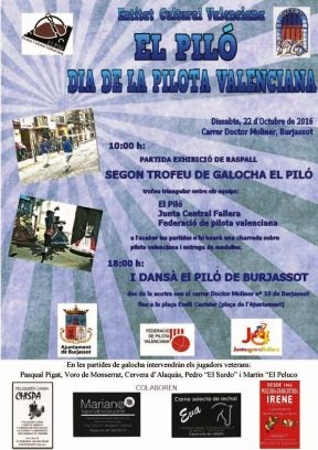 La jornada començarà a les 10 del matí, al carrer Doctor Moliner, 10, seu de l’entitat, amb la partida de pilota juvenil de raspall, en la qual poden participar totes i tots els xiquets que així ho desitgen. Una vegada finalitzada aquesta partida, tindran lloc el Trofeu Triangular Galotxa en el qual es comptarà amb la participació de Pascual Pigat, Voro de Monserrat, Vicent Cervera de Alaquás, Pedro “El Surdo” i Martín “El Peluco”. Participaran en els equips del Piló, Junta Central Fallera i la Federació de Pilota Valenciana.