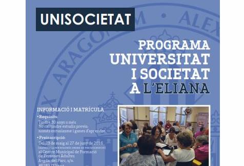UNISOCIETAT-l’Eliana és fruit de la col•laboració entre la Universitat de València, a través del Vicerectorat de Participació i Projecció Territorial, i l’Ajuntament de l’Eliana, amb el patrocini de Caixa Popular. El programa UNISOCIETAT s’imparteix en l’actualitat en 10 municipis valencians: Alzira, Benetússer, Cullera, l’Eliana, Gandia, Massamagrell, Ontinyent, Paterna, Quart de Poblet i Requena. Compta amb la participació de dos centenars de professors de la Universitat de València i aconsegueix una matrícula de més d’1.200 estudiants.