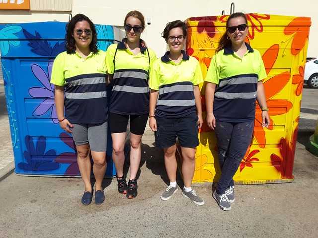 Quatre estudiants de Belles Arts d’Almussafes, contractades per a pintar a mà els contenidors