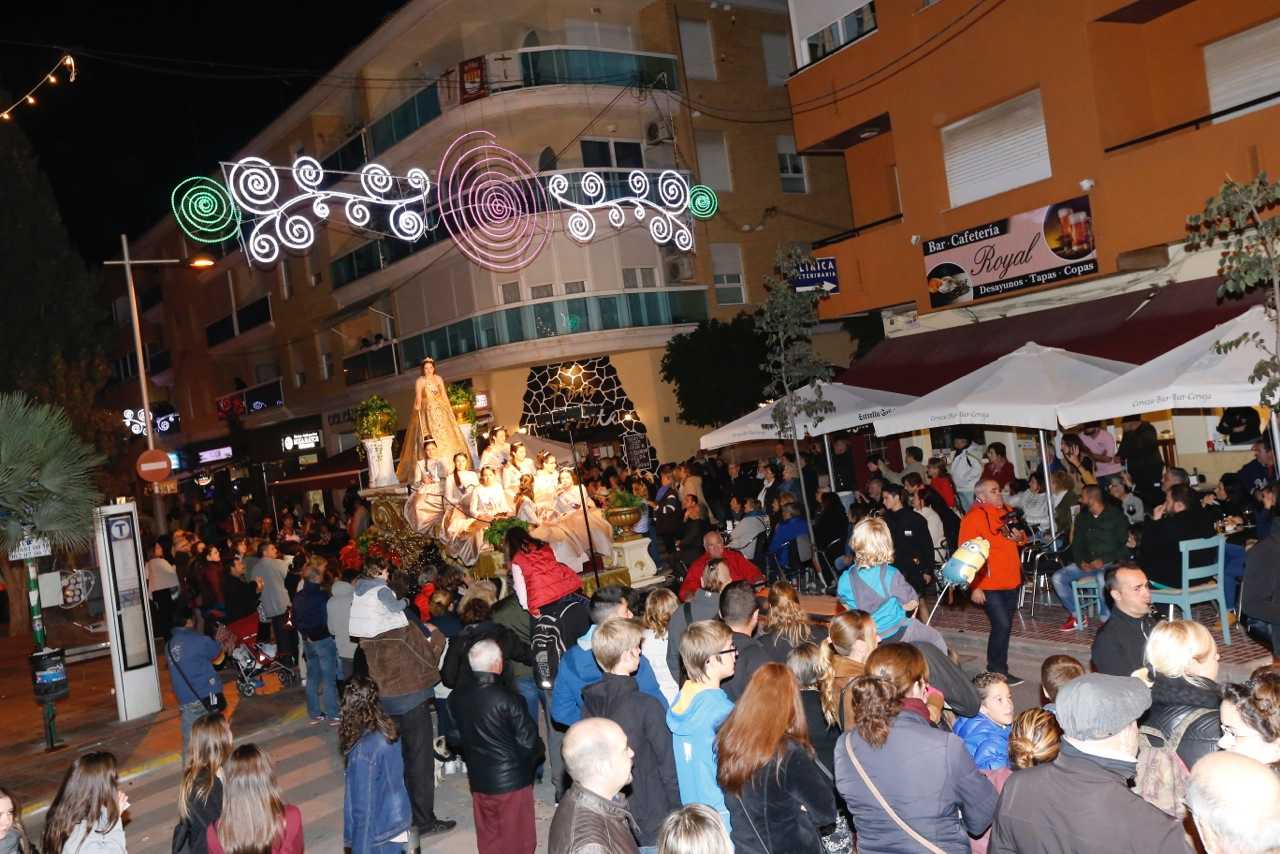Oscurísimos núvols que van descarregar de manera intermitent al llarg de tot el dia van mantenir en suspens a tots els festers de l’Alfàs del Pi, que miraven al cel amb el temor que la tan esperada pluja acabés per aigualir-los l’acte central d’aquest primer dilluns de festes que no era altre que la cavalcada multicolor. Per fortuna, el temporal va escampar i, encara que amb una mica de retard sobre l’horari previst, les reines d’aquestes festes van recórrer els carrers del municipi pujades sobre dues carrosses a les que van seguir les penyes, que van ser les encarregades de donar color, alegria i bon humor a aquesta desfilada.
