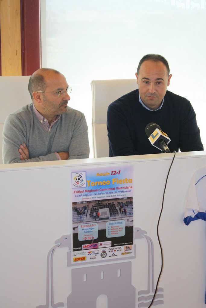 Els millors jugadors de Preferent de la Comunitat Valenciana s’enfronten aquest diumenge 28 de desembre a Ontinyent, amb la celebració XIII Torneig Festa del Futbol Regional a l’Estadi Municipal El Clariano. El Torneig, que es disputarà en forma de quadrangular de seleccions amb entrada lliure, era presentat aquest matí al Palau de la Vila, en un acte on el regidor d’Esports, Pepe Pla, agraïa al comitè organitzador “l’elecció perquè Ontinyent pugui convertir-se en punt de trobada per a aquesta gran festa del futbol valencià, en què no hi haurà vencedors ni vençuts ja que tots van a gaudir i fer-nos gaudir en un marc incomparable com és El Clariano”. Pla agraïa també que es vaja a retre homenatge a l’exjugador ontinyentí Pascual Donat, ex jugador del Vila-real CF a Primera Divisió i actualment delegat d’aquest de club, que ja fora distingit per l’Ajuntament amb un dels premis “9 d’octubre”.