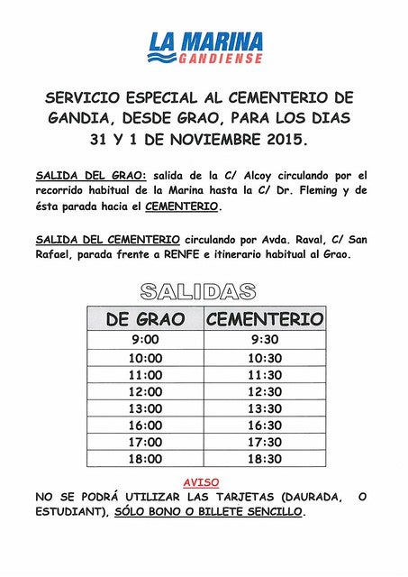 La eixida d’autobús des del Grau serà des del carrer Alcoi fins al carrer Doctor Fleming de Gandia des d’on es podrà continuar viatge fins al cementeri. Hi haurà autobús a les hores en punt des de les 9.00h fins les 13.00h i des de les 16.00h fins a les 18.00h.