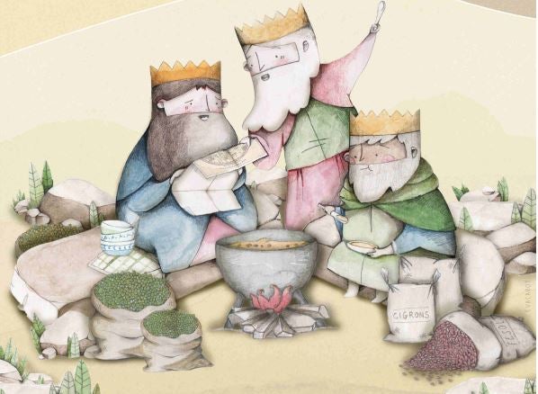 Cada any, la carta es dedica a un tema diferent. Enguany, aprofitant que ha sigut l’Any Internacional dels Llegums com a aliment saludable, trobem els reis menjant cigrons, fesols i llentilles. Eren homes molt savis i ja coneixien com eren de beneficiosos els llegums per a l’organisme.