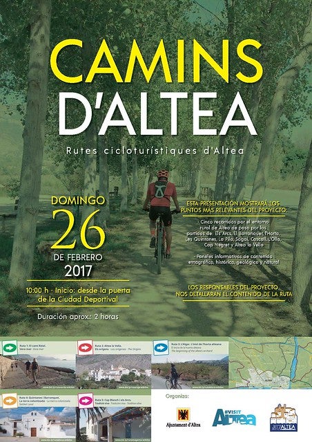 Juanfran Picó, representant de Gea, empresa responsable de la planificació i senyalització de les cinc rutes i l’historiador alteà, Juanvi Martín, explicaran el projecte al llarg del recorregut de la ruta verda i mostraran els punts més interessants del projecte. Anna Alvado, regidora de Turisme, ha convidat a tots els alteans i alteanes, així com a visitants i persones interessades a participar en aquesta activitat inaugural que recorrerà els paisatges més bells del nostre municipi.