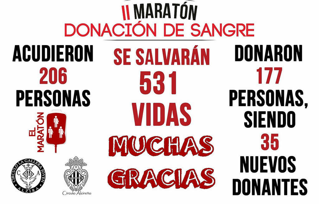 Adrián Sarria, membre del Círculo La Gallera Joven i organitzador de la II Marató, ens comunica la informació que s’ha fet pública hui mateix, respecte a l’èxit de participació, ja que durant la jornada del dissabte es varen enregistrar 177 donacions, de les quals 35 eren nous donants. Cal destacar que es presentaren 206 persones amb voluntat de fer la seua aportació, però alguns es quedaren fora per no reunir tots els requisits necessaris.