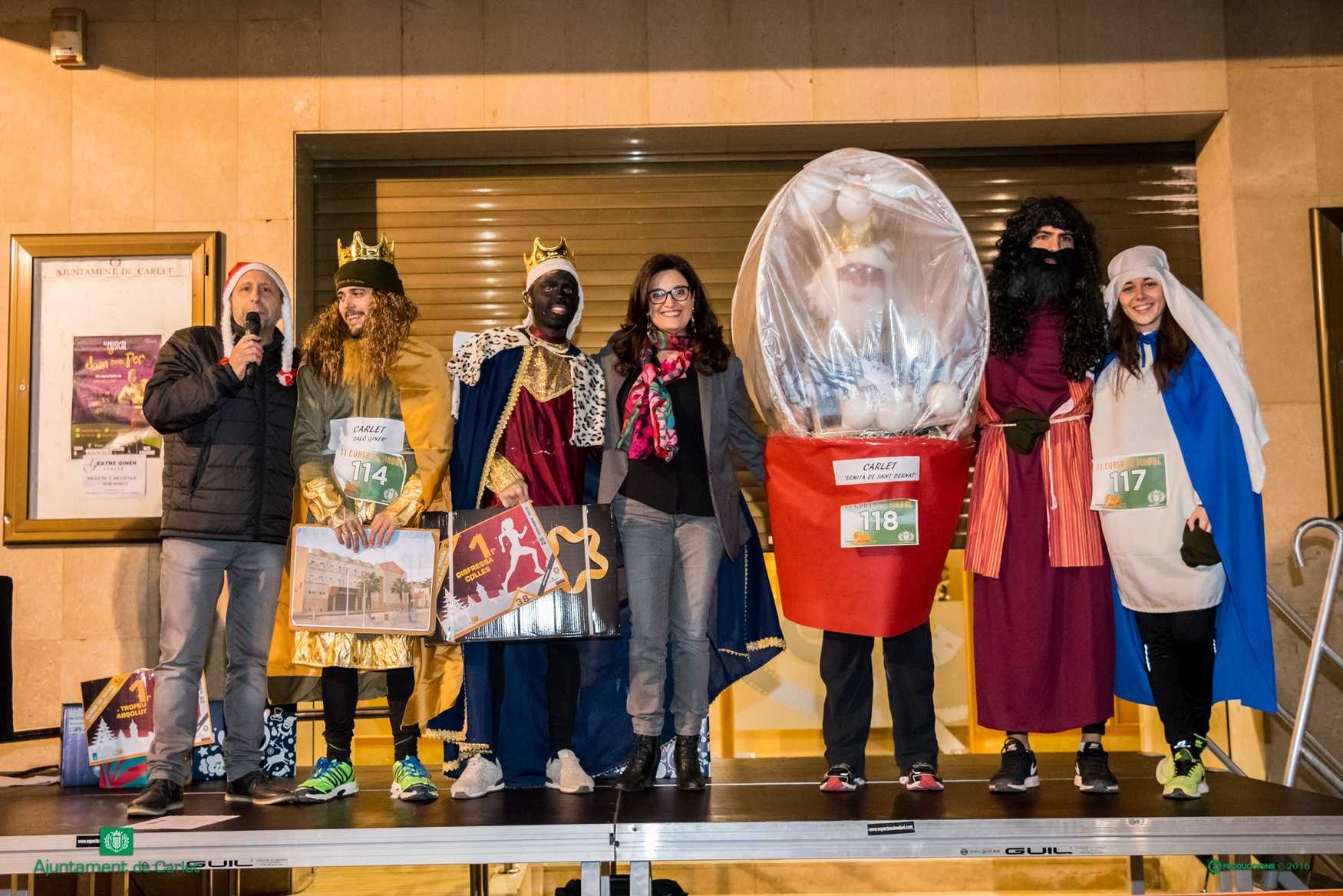 A més de la solidaritat, la participació en la cursa tenia premi, sobretot per a aquells que decidiren tancar l’any disfressats. Al finalitzar la cursa s’entregaren premis a les millors disfresses individuals i de colles i també trofeus a l’home i a la dona que arribaren en primera posició a la meta. Enguany la novetat va ser el premi 90 Aniversari Carlet Ciutat, que es va atorgar al grup disfressat més nombrós que va fer el recorregut, un premi que va aconseguir el grup de karatekes locals.