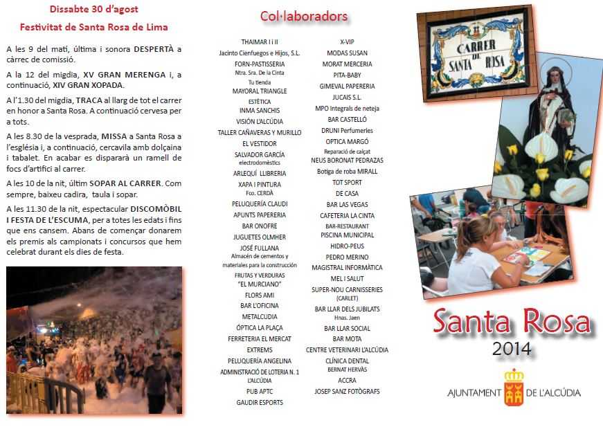 Durant quatre dies, els veïns de Santa Rosa de totes les edats eixiran al carrer per a celebrar les seues festes. Els xiquets podran gaudir del Parc d’Educació Vial, de Biblioparcs, dibuix lliure, jocs tradicionals i cucanyes i, a més, una gran merengà. També han programat jocs per als adults, com els campionats de dòmino, truc i parxís, així com els diversos bingos. I, per a acabar el dia, la celebració continua amb la nit de disfresses o la festa de l’espuma