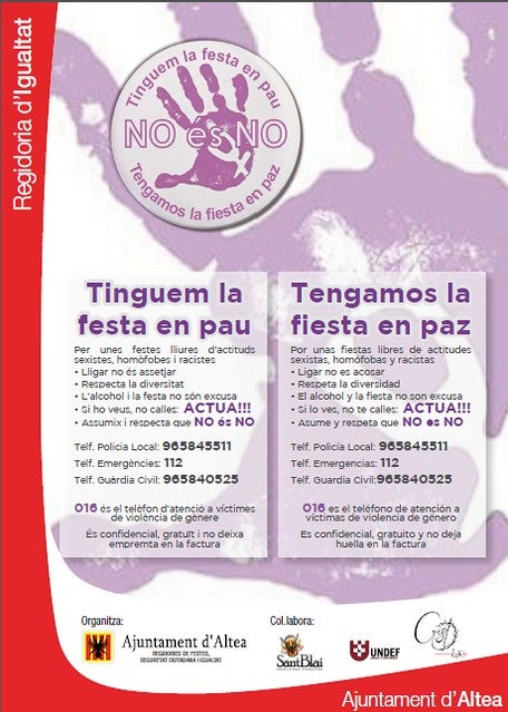 L’objectiu de la campanya, como ha explicat la regidora d’Igualtat, ‘’és fomentar el respecte i la bona convivència entre tots els alteans, alteanes, festers i visitants en estos dies per tal que celebrem les festes lliures d’actituds sexistes, homòfobes i racistes’’.