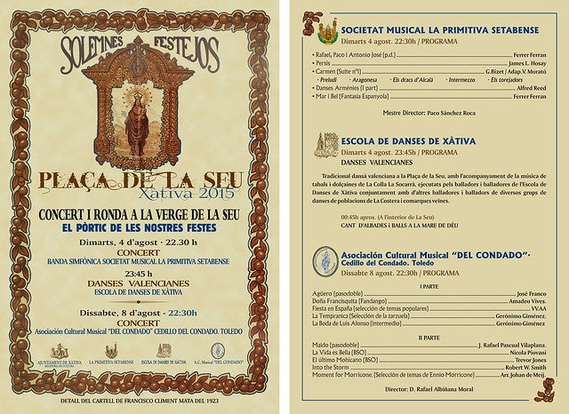El les festes d’aquest any, s’amplia la programació artística: al 4 d’agost, la Primitiva Setabense realitza un concert a les 22:30 en Plaça la Seu; a les 24:00 hores es farà una dansada protagonitzada per l’Escola de Danses de Xàtiva al voltant de la plaça. I, com a novetat, el 8 d’agost hi haurà una actuació de danses dirigida pel xativí Rafa Almiñana.